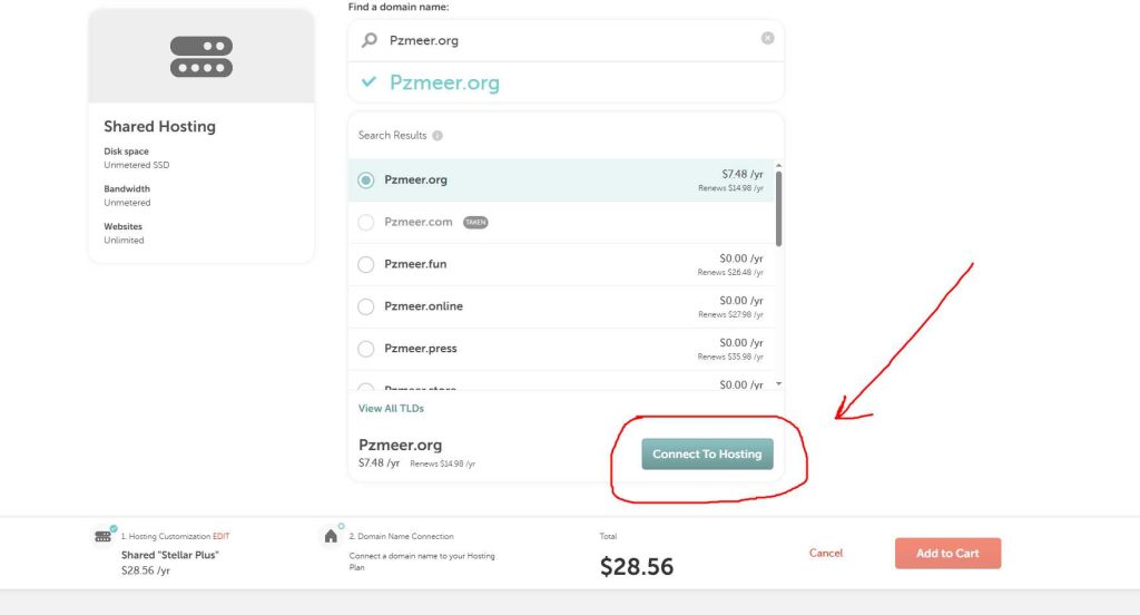 Step 3: Select ‘New Domain Name’ and ‘New Purchase’, enter your desired domain name, click ‘Find a domain name’, then select ‘Connect to hosting’ and add to cart.